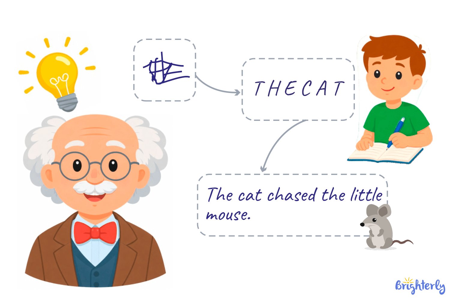 Here, children make a big leap forward. They no longer just pick up individual sounds; they try to write everything they hear in a word. That’s why words often look longer and “strange,” but still very logical. For example, they might write “frend” instead of “friend” or “sed” instead of “said.”