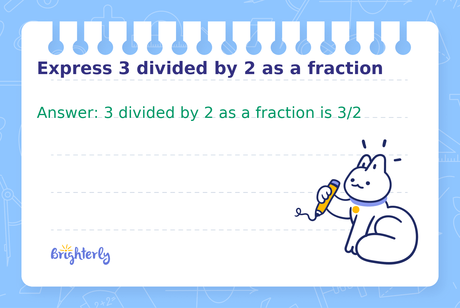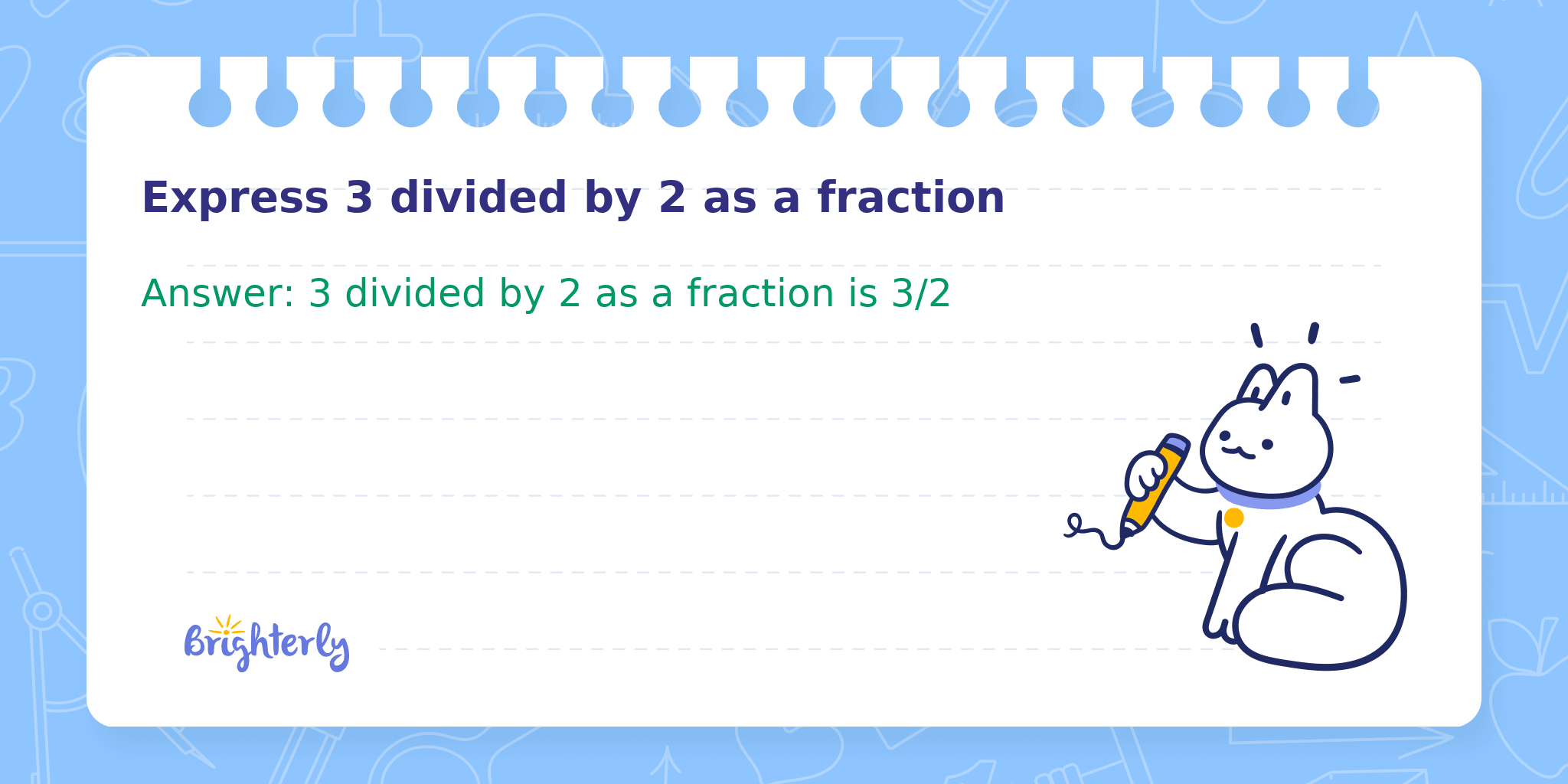 Dividing one number by another can often be represented as a fraction, where the dividend becomes the numerator and the divisor becomes the denominator. In this way, '3 divided by 2' is equivalent to writing the fraction 3/2, which is known as an improper fraction.