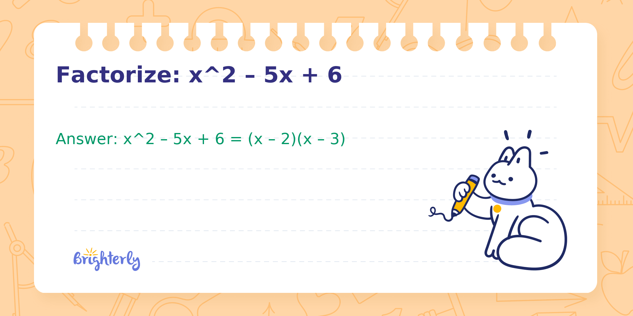Answer: x^2 – 5x + 6 = (x – 2)(x – 3)
