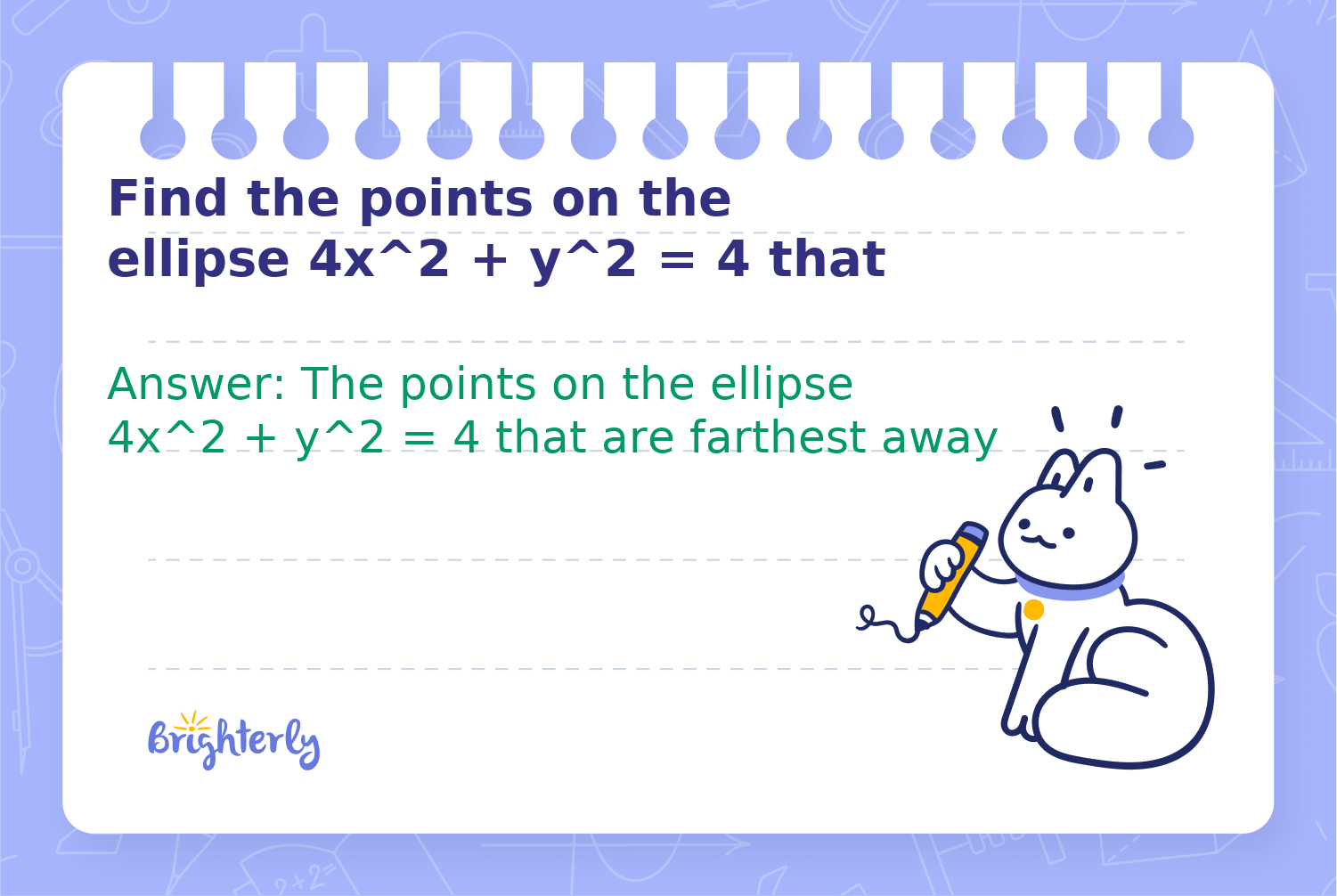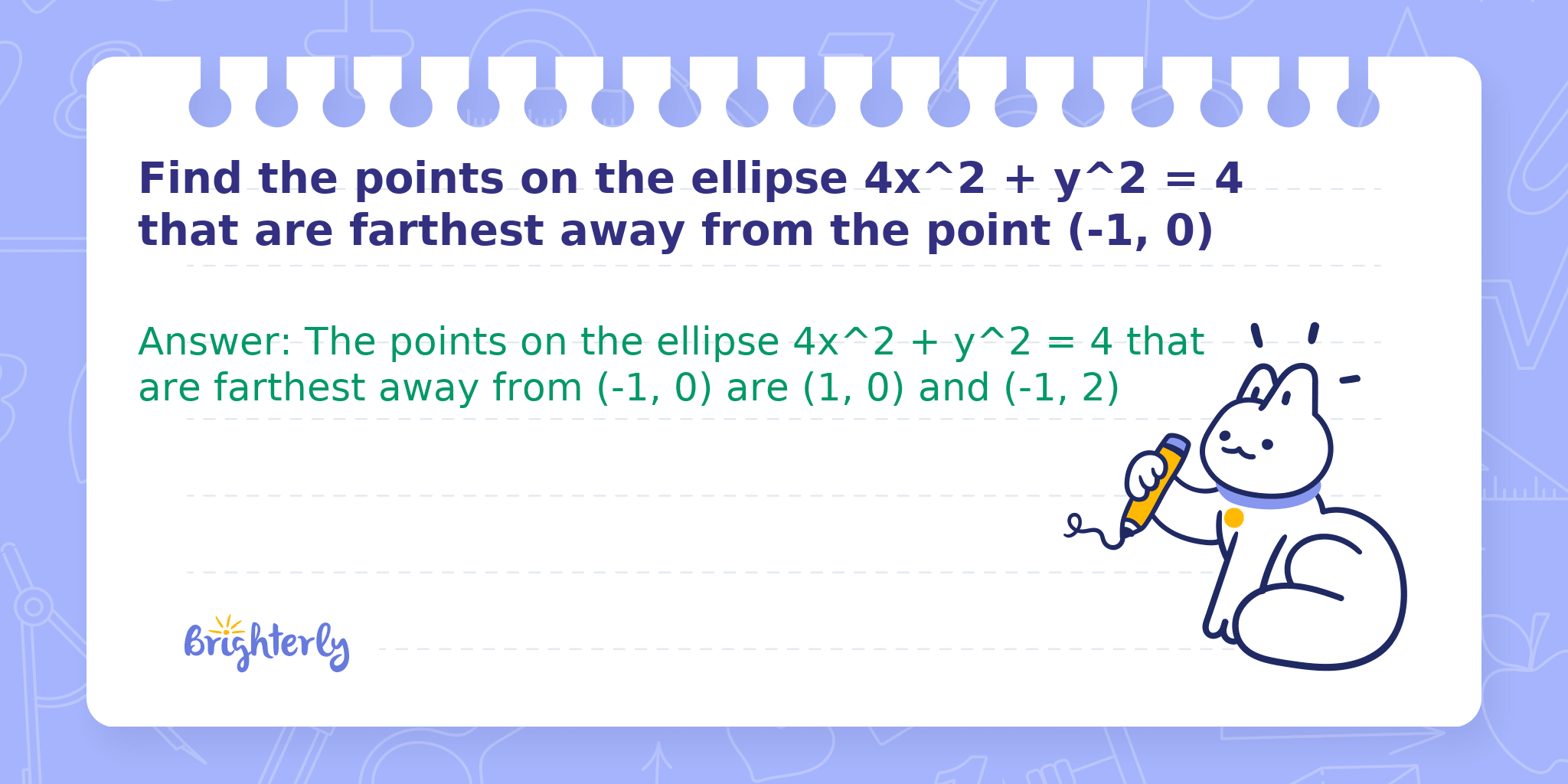 Answer: The points on the ellipse 4x^2 + y^2 = 4 that are farthest away from (-1, 0) are (1, 0) and (-1, 2)