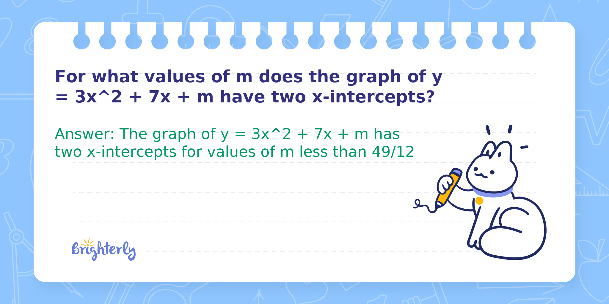 For what values of m does the graph of y = 3x^2 + 7x + m have two x-intercepts?