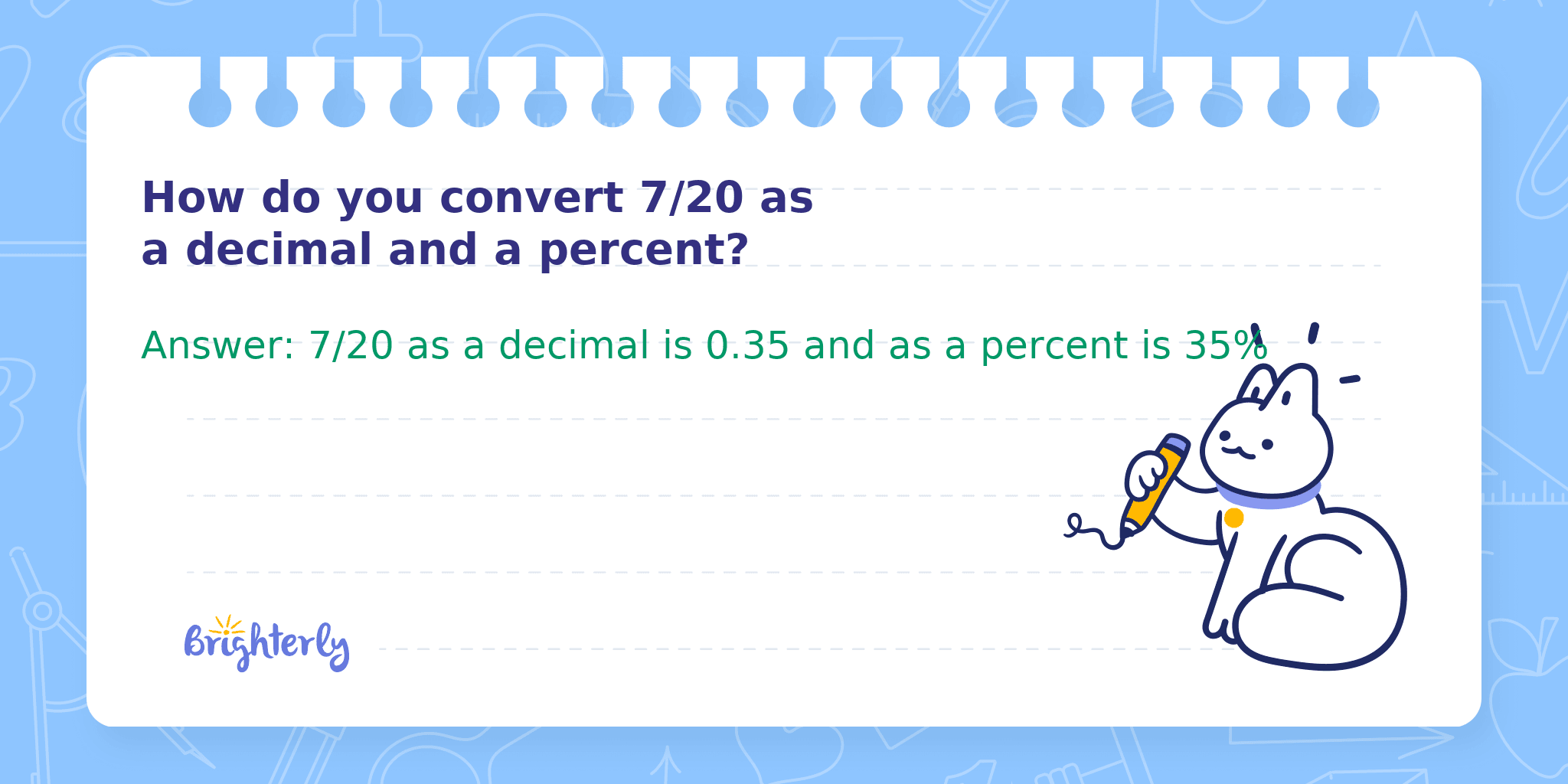 Answer: 7/20 as a decimal is 0.35 and as a percent is 35%