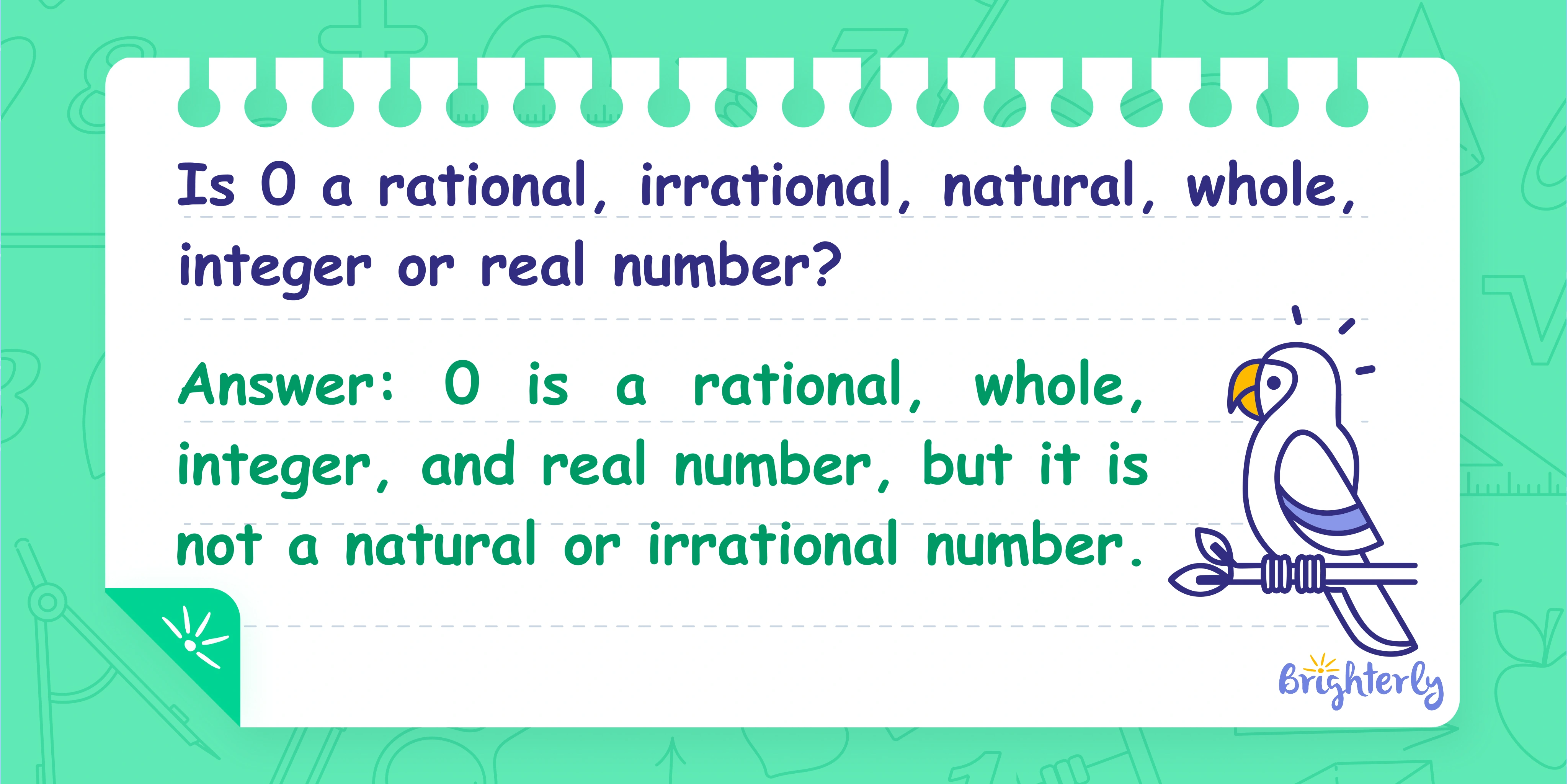 Answer: 0 is a rational, whole, integer, and real number, but it is not a natural or irrational number