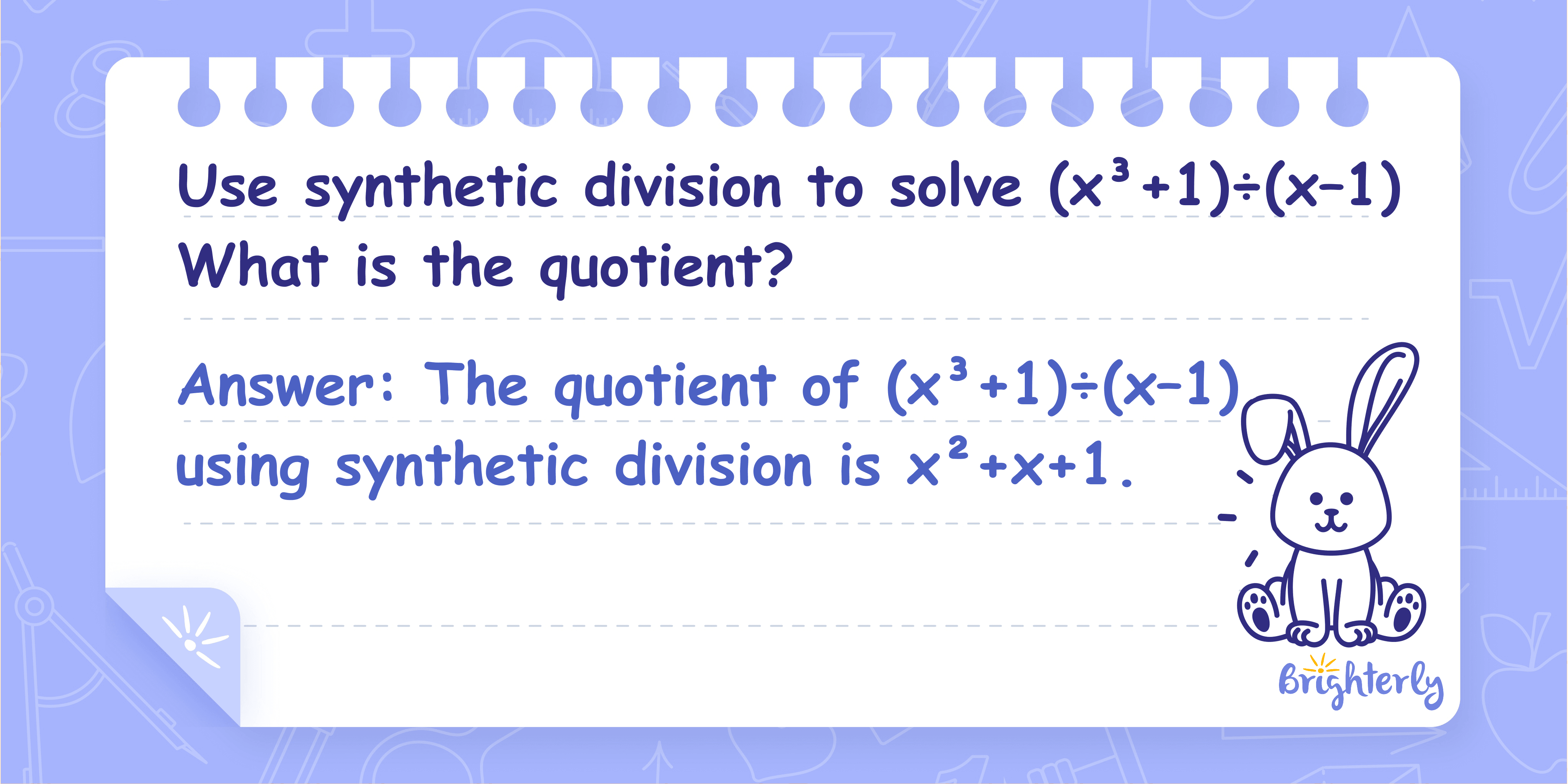 Answer: The quotient of (x³ + 1) ÷ (x – 1) using synthetic division is x² + x + 1