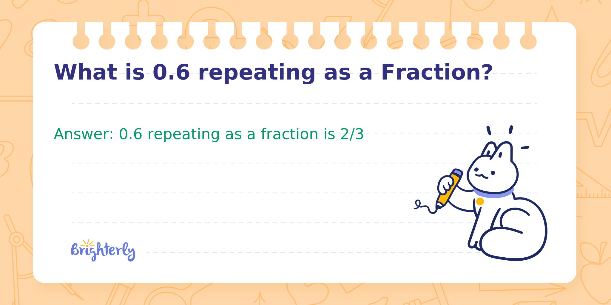 The decimal 0.6 repeating, often written as 0.666... with an infinite sequence of sixes, is a common recurring decimal in mathematics. Transforming repeating decimals to fractions helps us represent them precisely without an infinite sequence. Let's explore how 0.6 repeating can be written as a fraction.