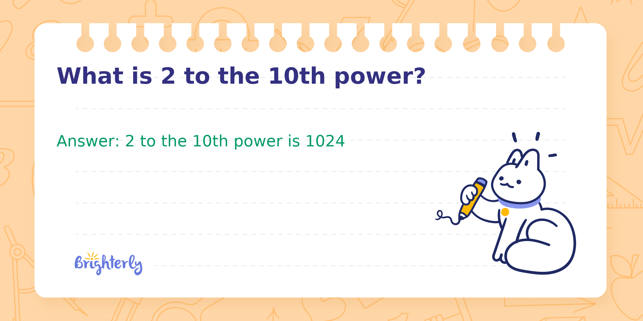 Step 1: Step 1: Write out 2 multiplied by itself 10 times (2 × 2 × 2 × 2 × 2 × 2 × 2 × 2 × 2 × 2)