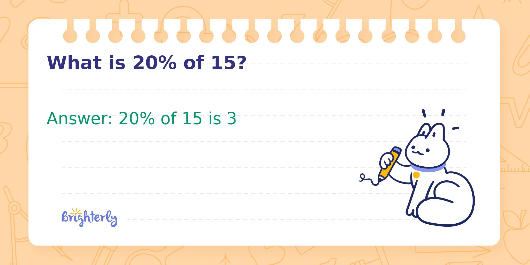Finding a percentage of a number is a fundamental math skill, useful in daily life for calculating discounts, tips, and data analysis. This problem asks you to determine what 20% of the number 15 is, which involves basic multiplication or the use of fractions.