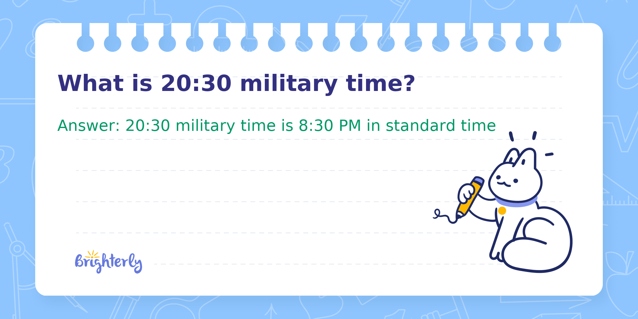 Answer: 20:30 military time is 8:30 PM in standard time