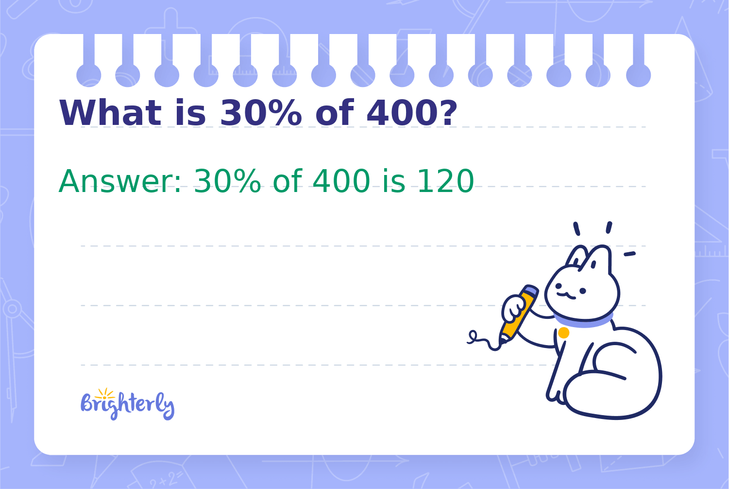 Finding a percentage of a number involves determining how much that number represents out of 100. In this case, 30% of 400 asks us to find the value that corresponds to 30 parts out of 100 parts of 400. This skill is commonly used in real-life situations such as calculating discounts, taxes, or statistics.