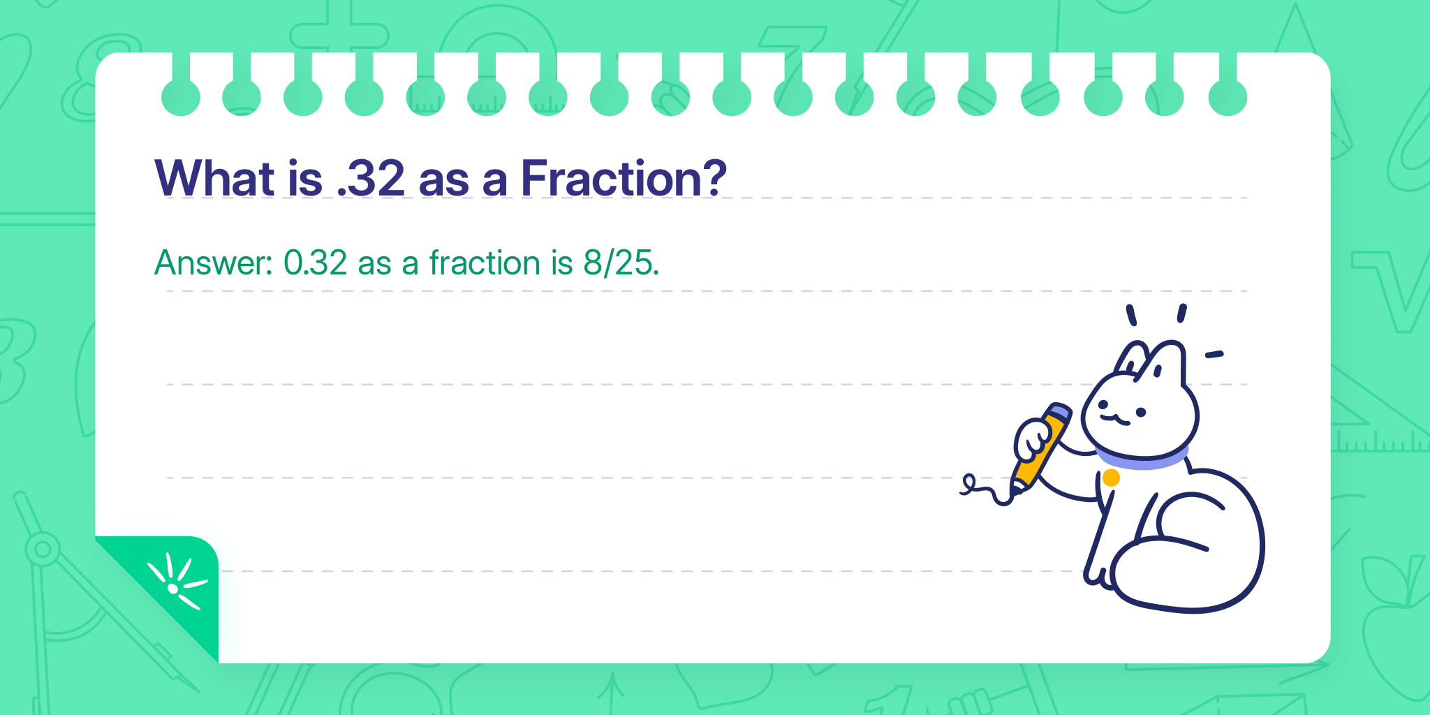 Step 1: Write 0.32 as 32/100 because it has two digits after the decimal (32 hundredths).