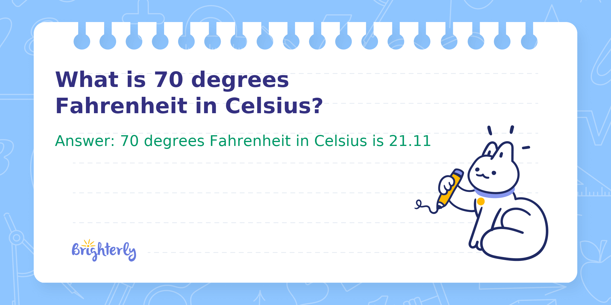 Answer: 70 degrees Fahrenheit in Celsius is 21.11
