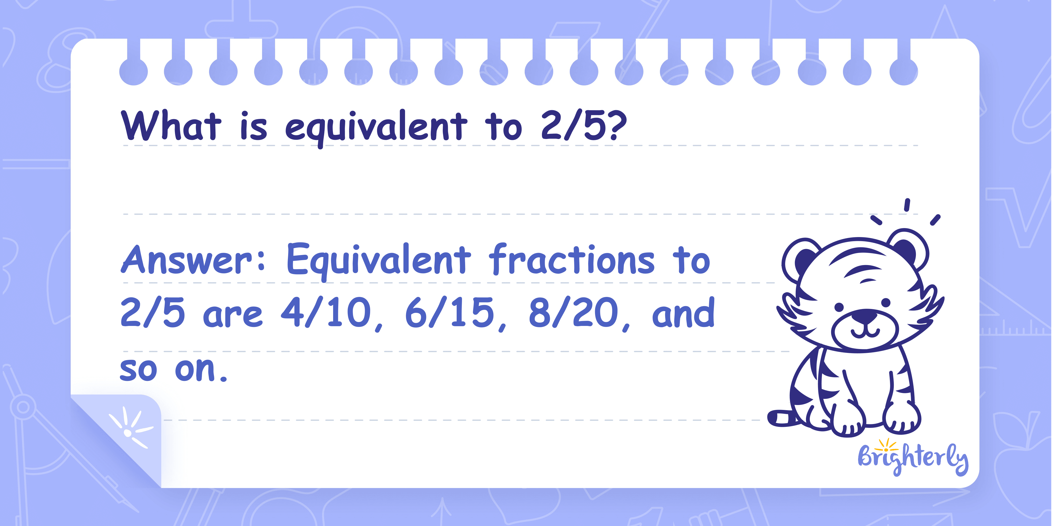 Answer: Equivalent fractions to 2/5 are 4/10, 6/15, 8/20, and so on