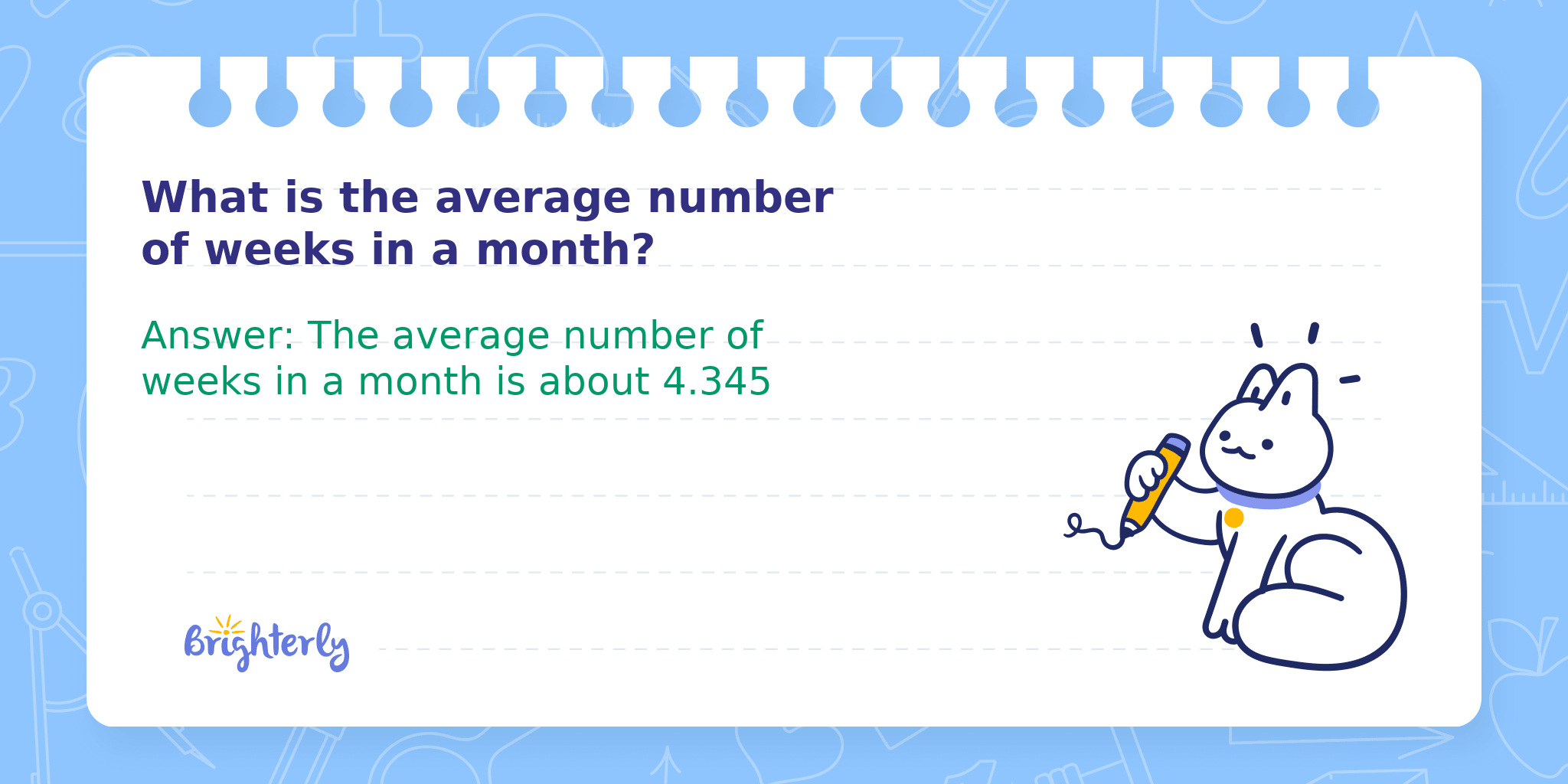 Answer: The average number of weeks in a month is about 4.345