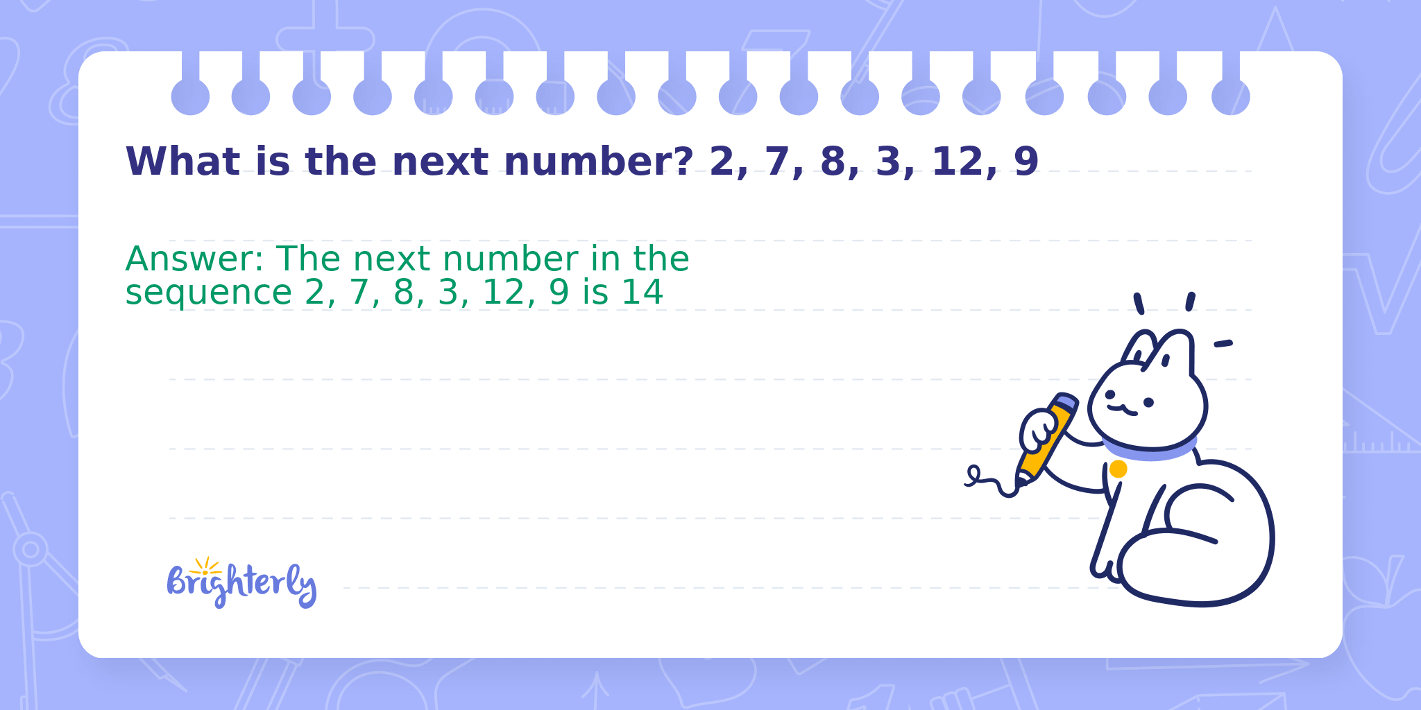 Answer: The next number in the sequence 2, 7, 8, 3, 12, 9 is 14