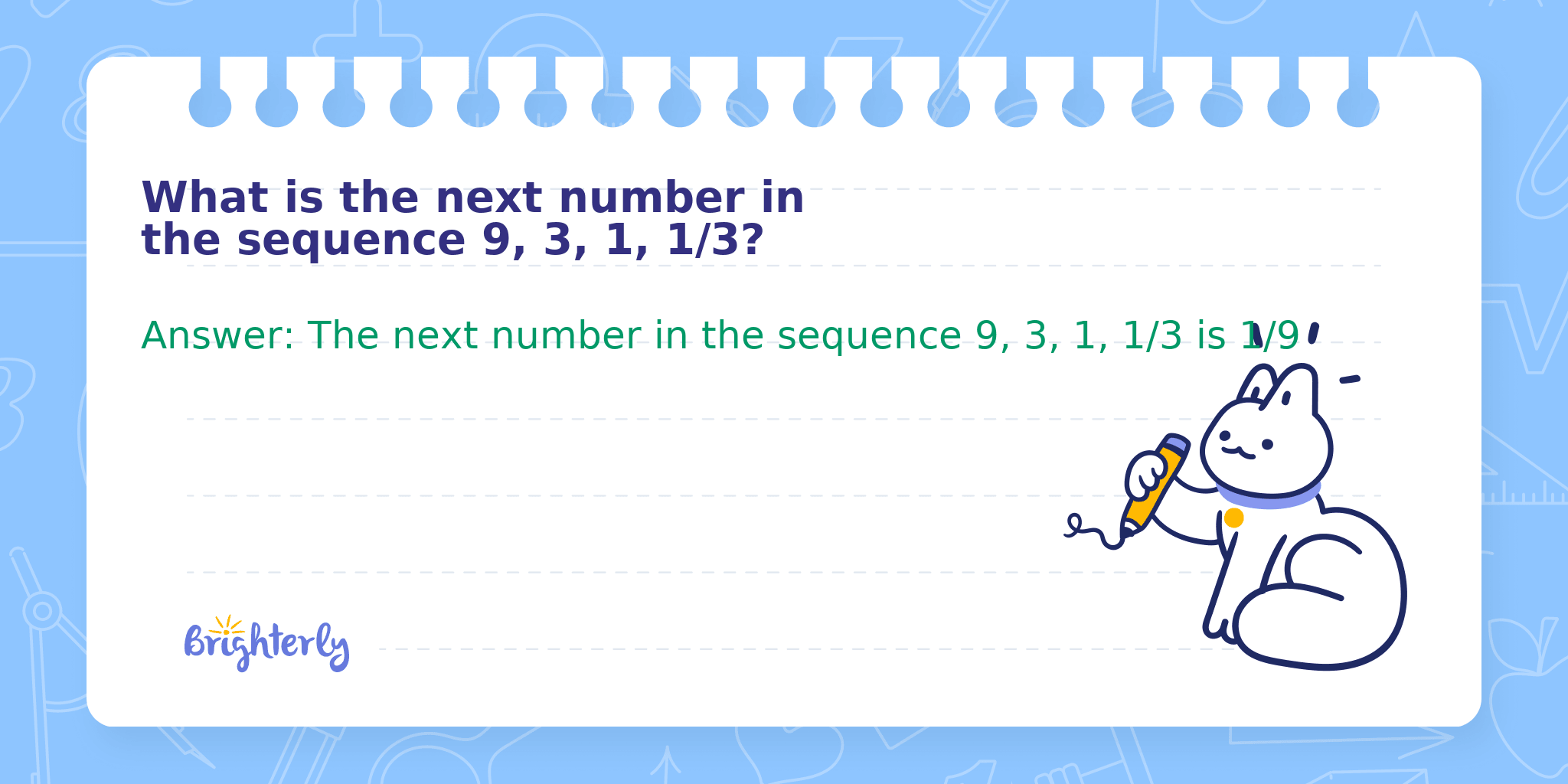 Answer: The next number in the sequence 9, 3, 1, 1/3 is 1/9