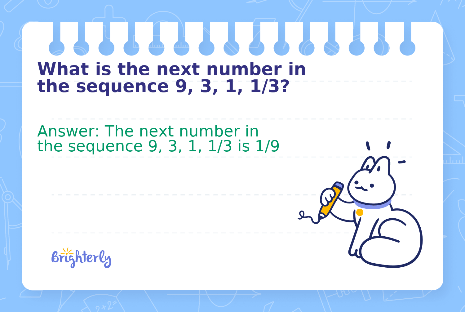 What is the next number in the sequence 9, 3, 1, 1/3?