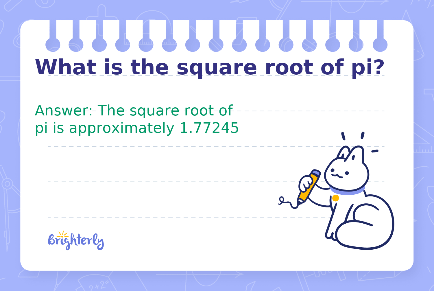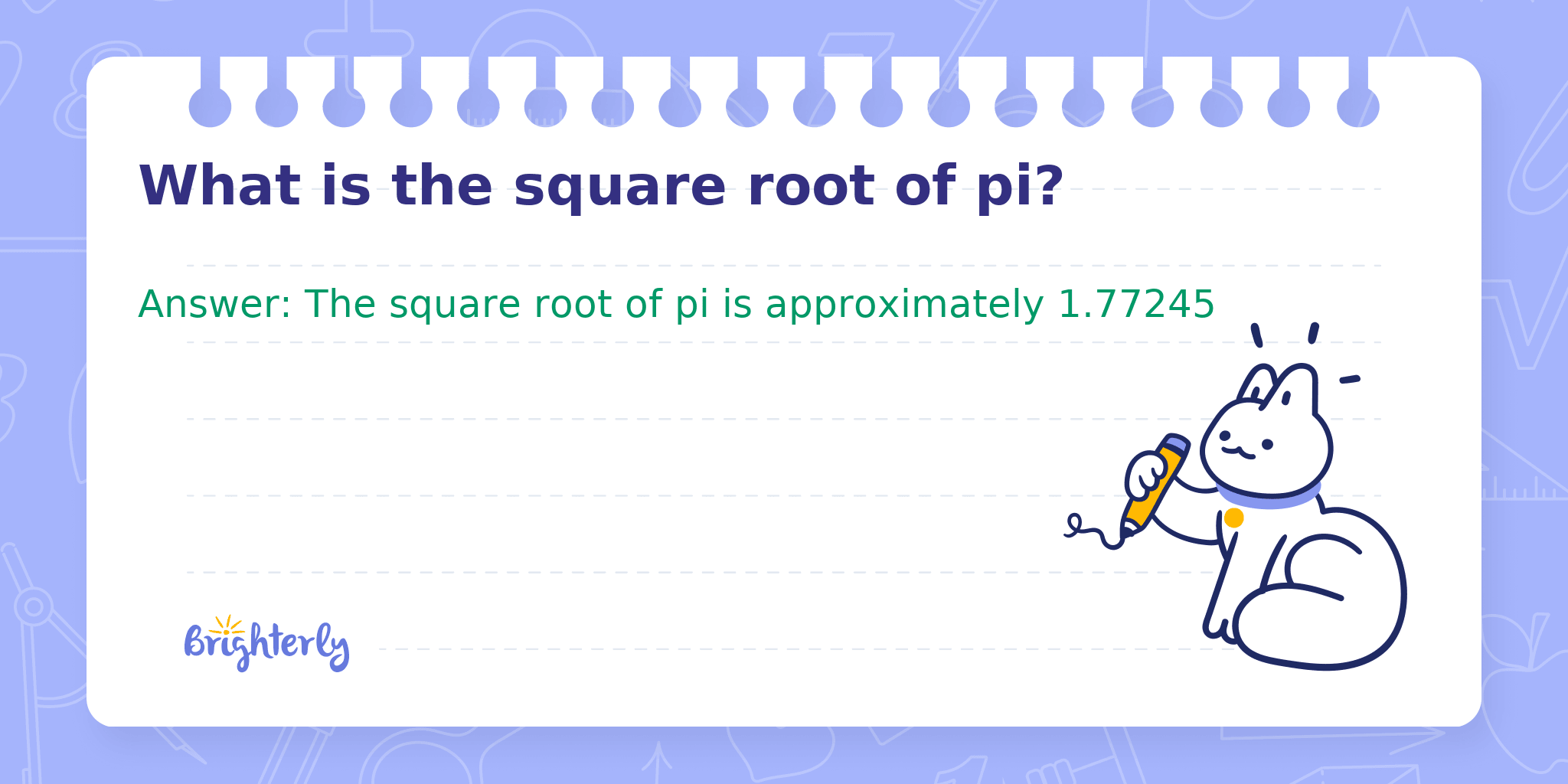 The square root of pi (π) is the number that, when multiplied by itself, gives the value of pi. Pi is an irrational number commonly known for its role in the geometry of circles and is approximately equal to 3.14159. Finding the square root of such irrational numbers often requires approximation methods or a calculator.
