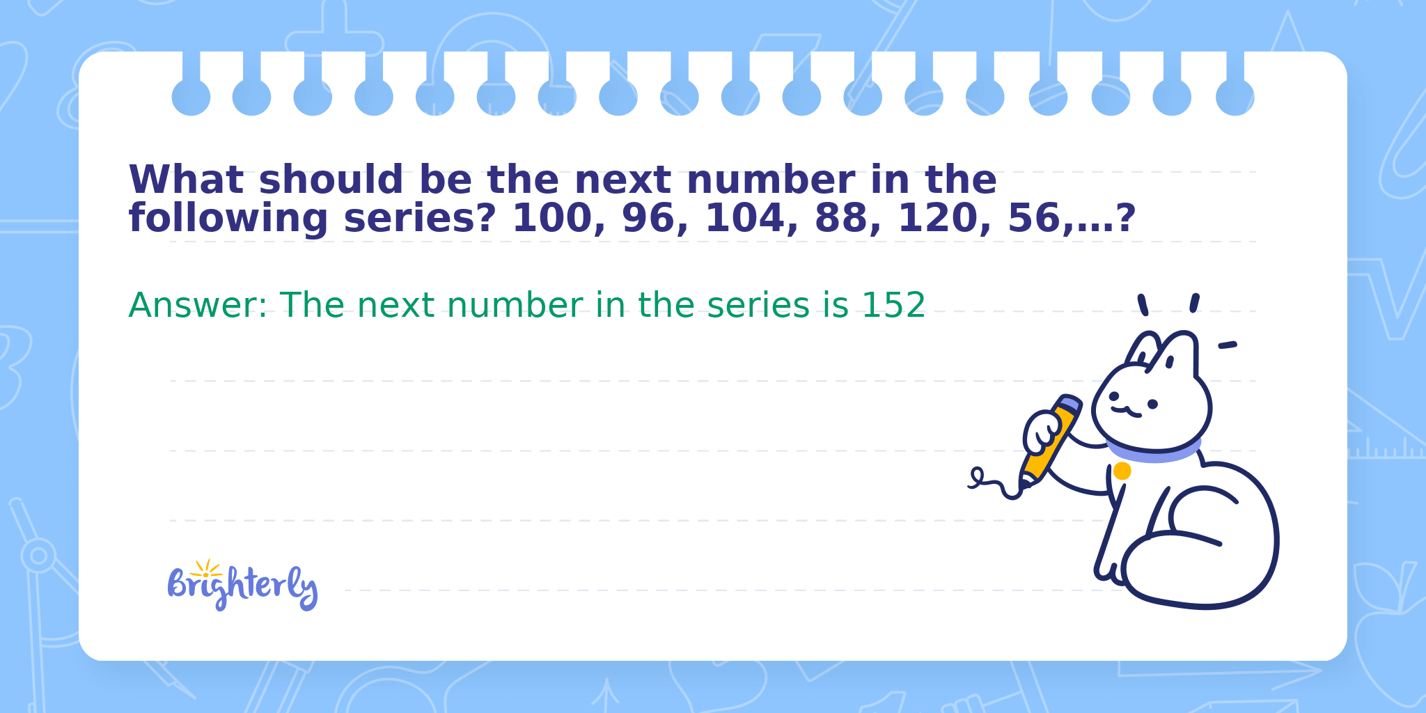 This problem asks for the next number in a pattern-based sequence: 100, 96, 104, 88, 120, 56, ... Sequence questions often rely on identifying an underlying pattern between the terms, which could involve alternating rules, arithmetic operations, or geometric changes. Let's analyze the sequence to determine the rule and predict the next number.
