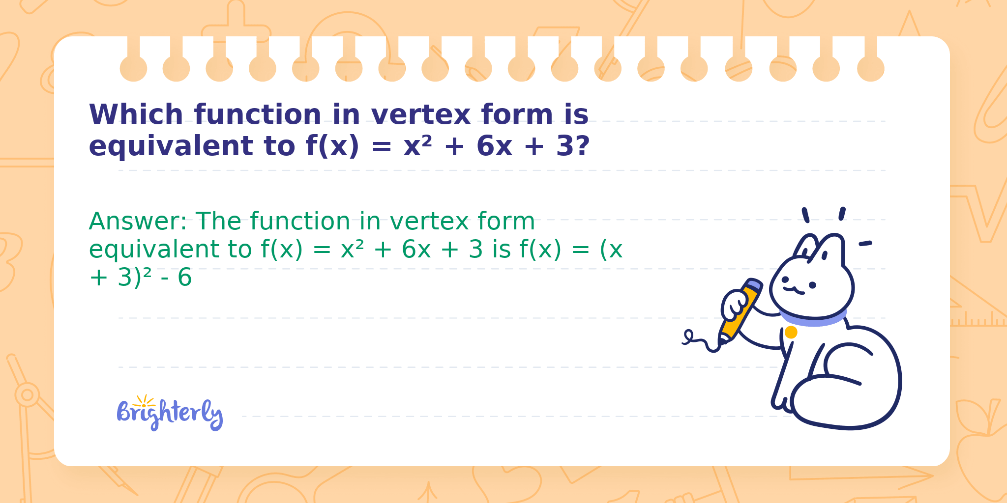 Answer: The function in vertex form equivalent to f(x) = x² + 6x + 3 is f(x) = (x + 3)² - 6