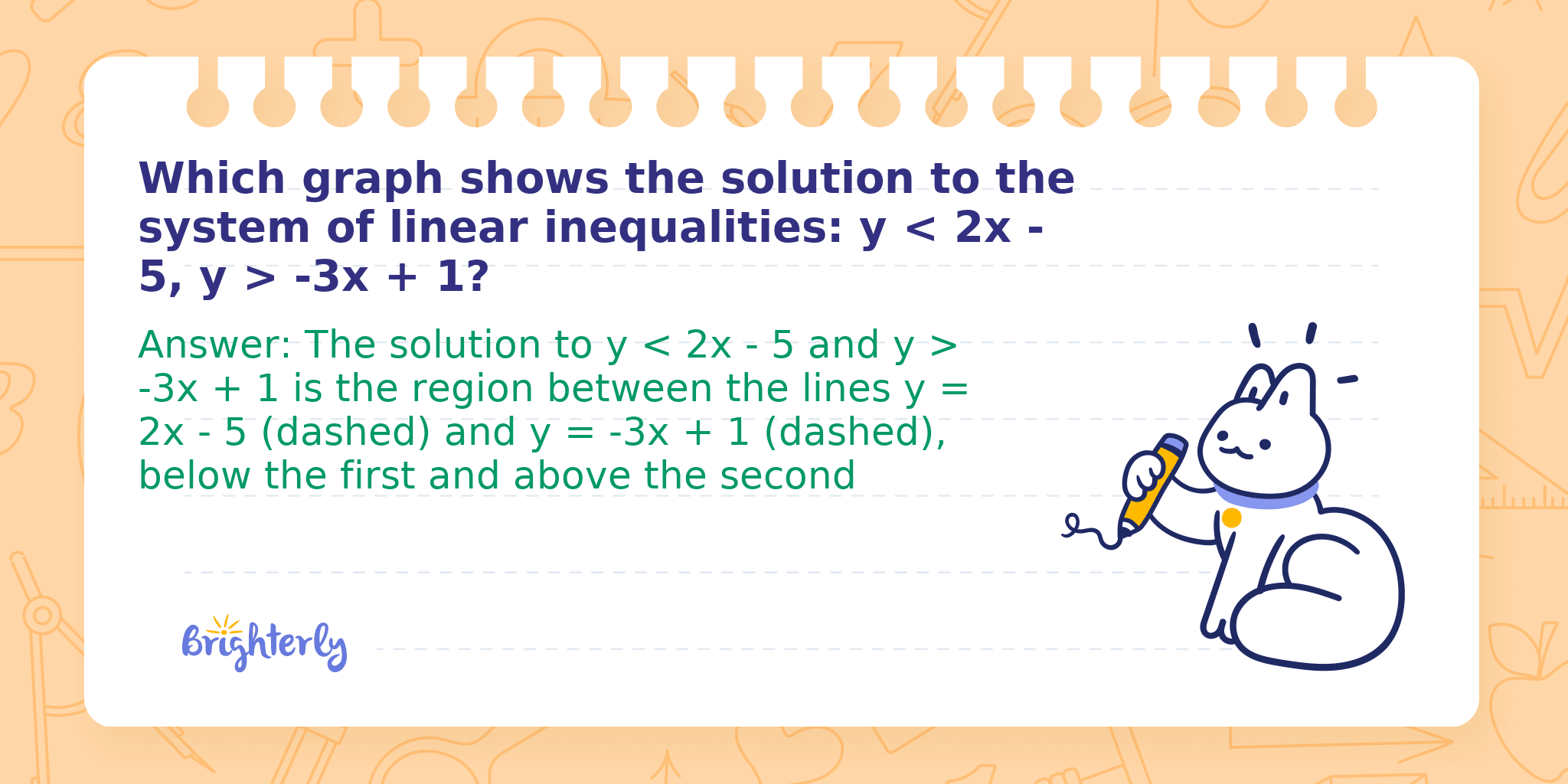 Answer: The solution to y < 2x - 5 and y > -3x + 1 is the region between the lines y = 2x - 5 (dashed) and y = -3x + 1 (dashed), below the first and above the second
